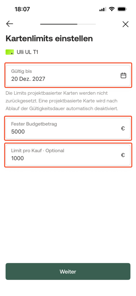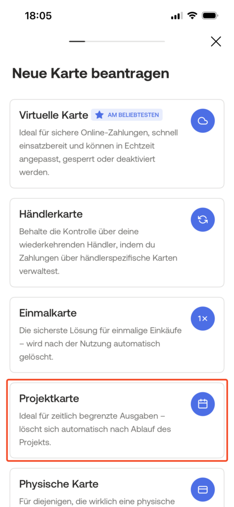 Wichtig: Eine Projektkarte und keine (reguläre) virtuelle Karte mit Monats- oder Jahreslimit beantragen