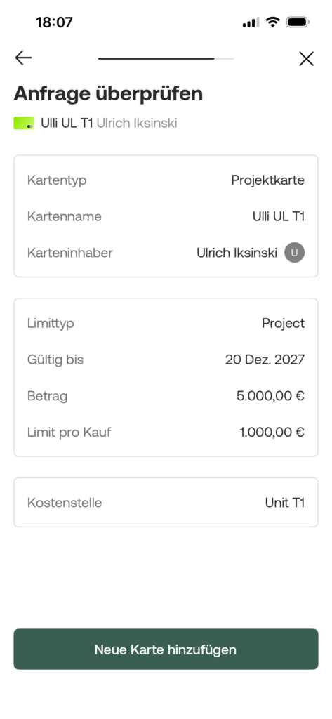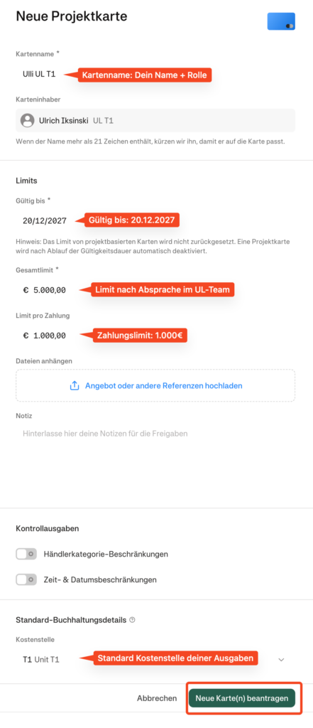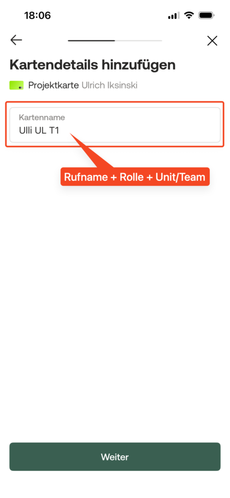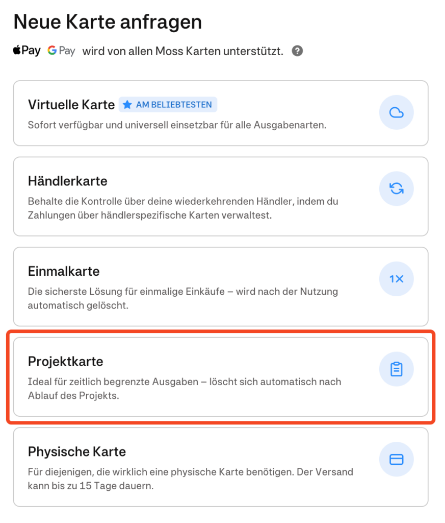 Wähle Projektkarte und gib der Karte einem Namen. Der Name soll dem Finance Team hilft, die Karte zuzordnen: