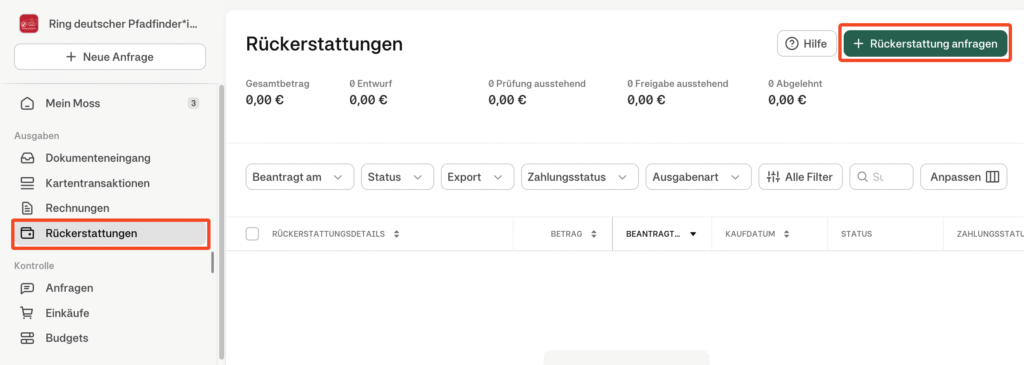 Eine neue Rückerstattung legt ihr mit dem Button „Rückerstattung anfragen“ im Bereich „Rückerstattung“ an. Ihr könnt eine Rückerstattung zwischenspeichern und weiter bearbeiten bevor ihr sie dann zur Freigabe bzw. Überprüfung (durchs Finance Team) einreicht.