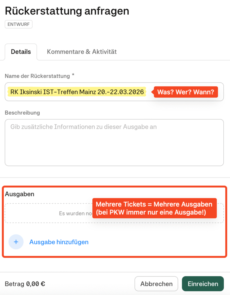 Rückerstattung = Gesammelte Ausgaben (Reisekosten) zu einer Veranstaltung, z.B. dem 1. IST-Treffen in Mainz