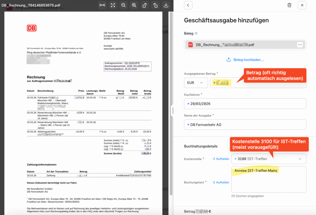 Wenn du eine Geschäftsausgabe einreichst (weil du Bahntickets hast), kannst du die Rechnung oder das Bahnticket (bei der DB akzeptieren wir auch das PDF Bahnticket als Beleg) hochladen. Im Normalfall werden die meisten Felder automatisch ausgefüllt und die Kosten von der Rechnung automatisch erkannt.