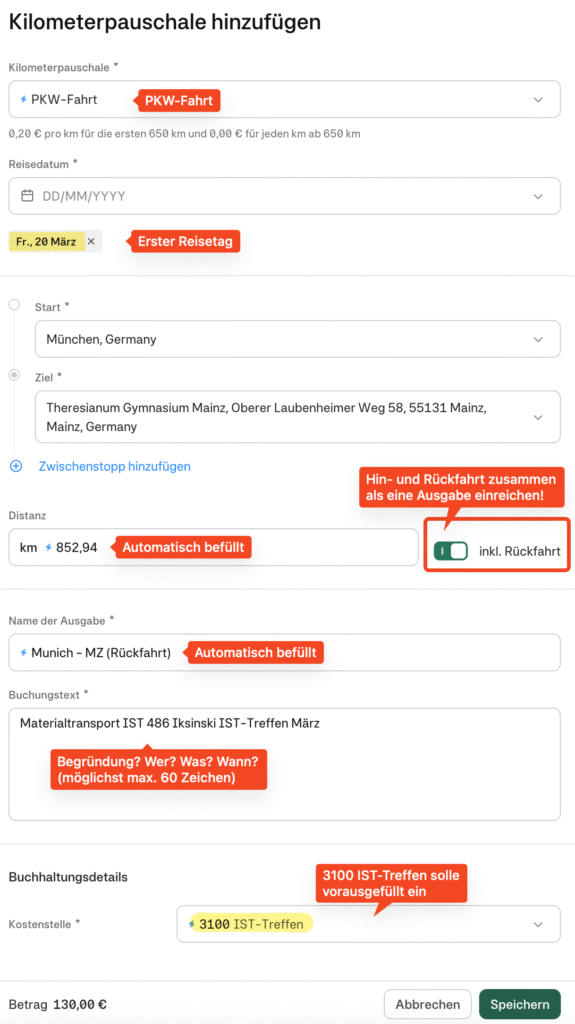 Im Buchungstext müsst ihr die PKW-Nutzung begründen und wie üblich kompakt die Fragen Wer? Was? und Wann? beantworten.